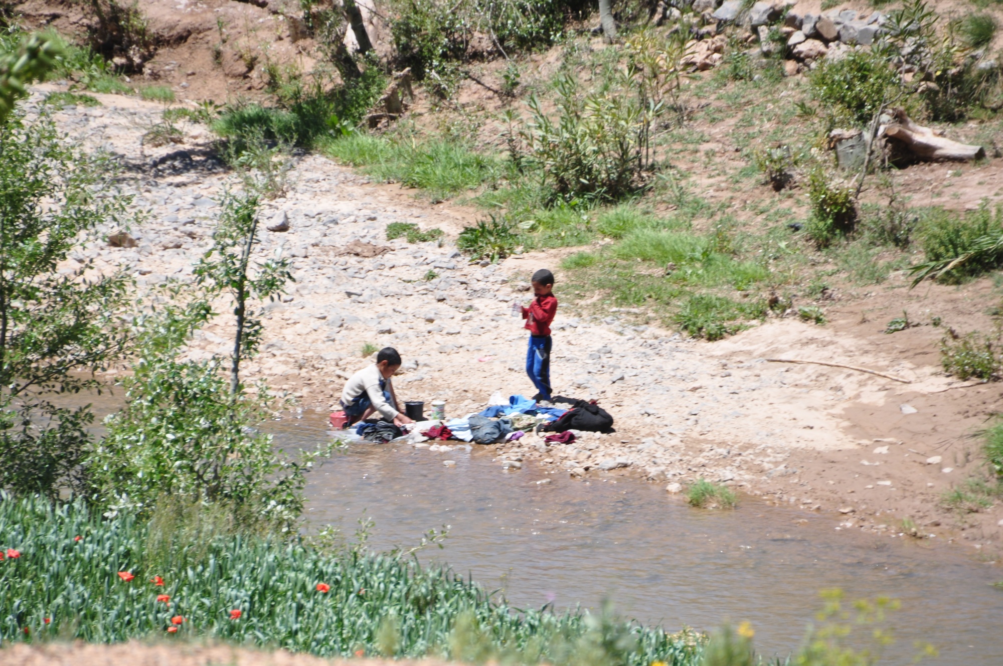 Lessive au bord de la rivière, les garçons continuent pendant que maman fait un aller-retour.
