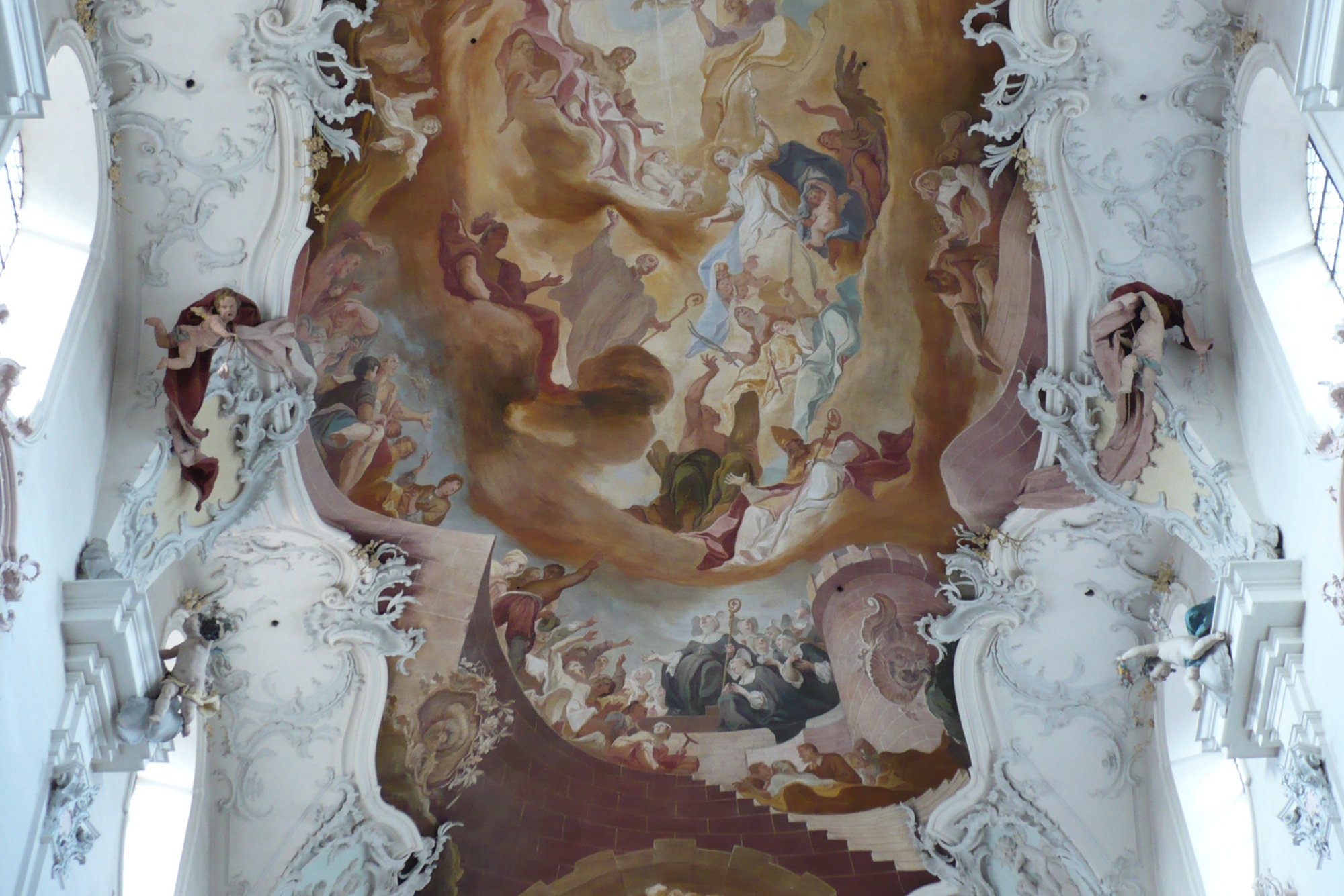 Voûte sculptée de l'église abbatiale avec une superbe fresque. Les draps des petits anges sont aussi sculptés !!!