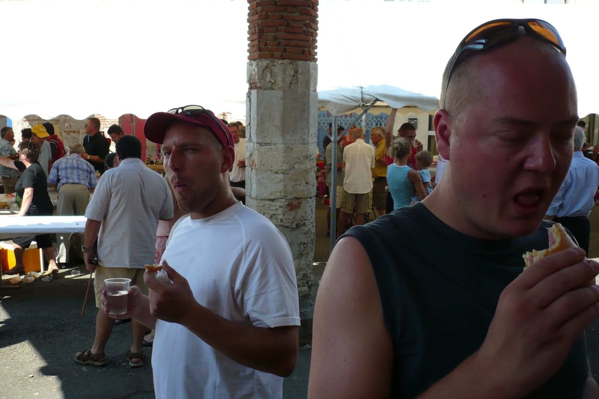 On commence à mourir de faim quand on nous annonce la fête à Sérignac. Quatre sandwiches jambon fromage en plein milieu de l'apéro du 15 août offert à tous devant l'église du village.